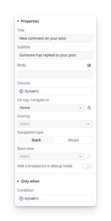 * **Devices:** needs to be populated with the [*device* data type](#the-devices-data-type) from one or more users. If you are sending a push notification to the current user, you can use the dynamic expression described in the [section above](#the-devices-data-type).