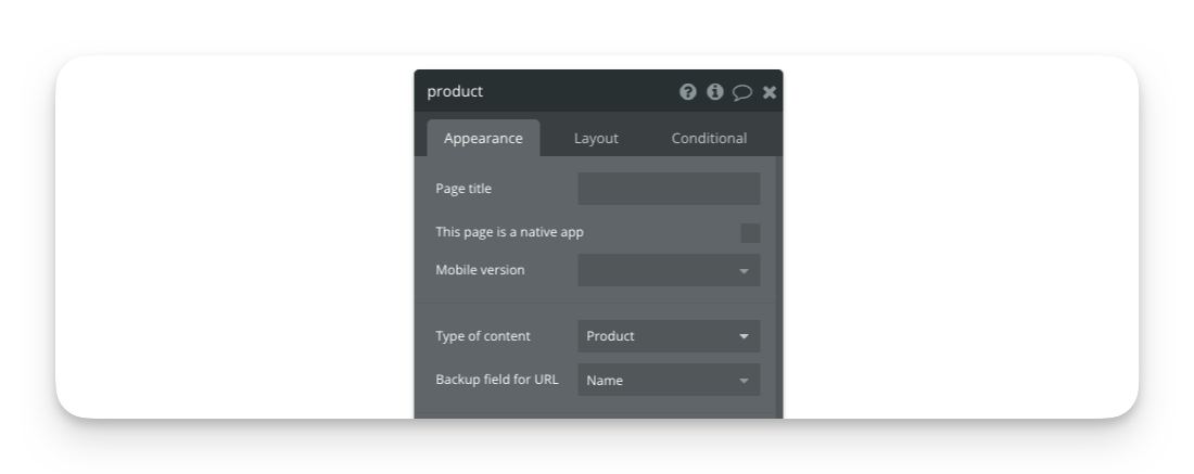 In the example above, we've set the Type of content to the Product data type. This means Bubble is ready to accept a Product thing that we'll pass through the URL. There are two ways in which Bubble will recognize a page thing in the URL: