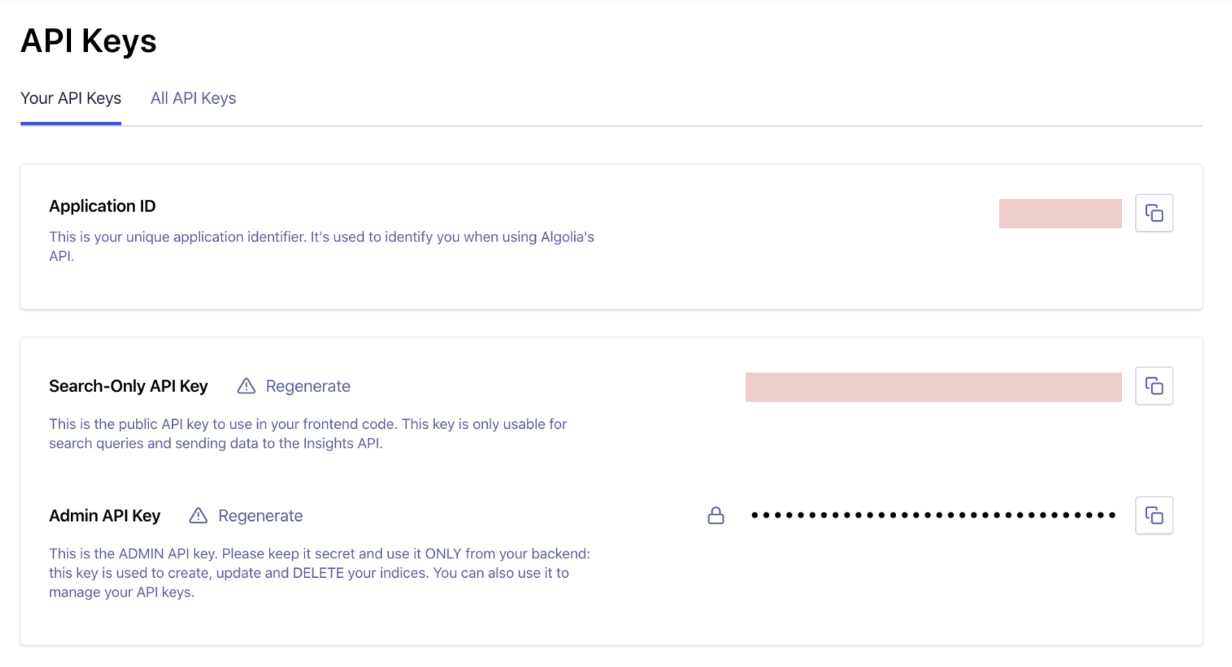 To start off, you must have your own Algolia account and copy your Algolia keys into your app’s Settings. When creating an Algolia account, you do not have to create indices yourself. Instead, right after signing up, you should visit the "API Keys" section of the dashboard. You will see a screen like this: