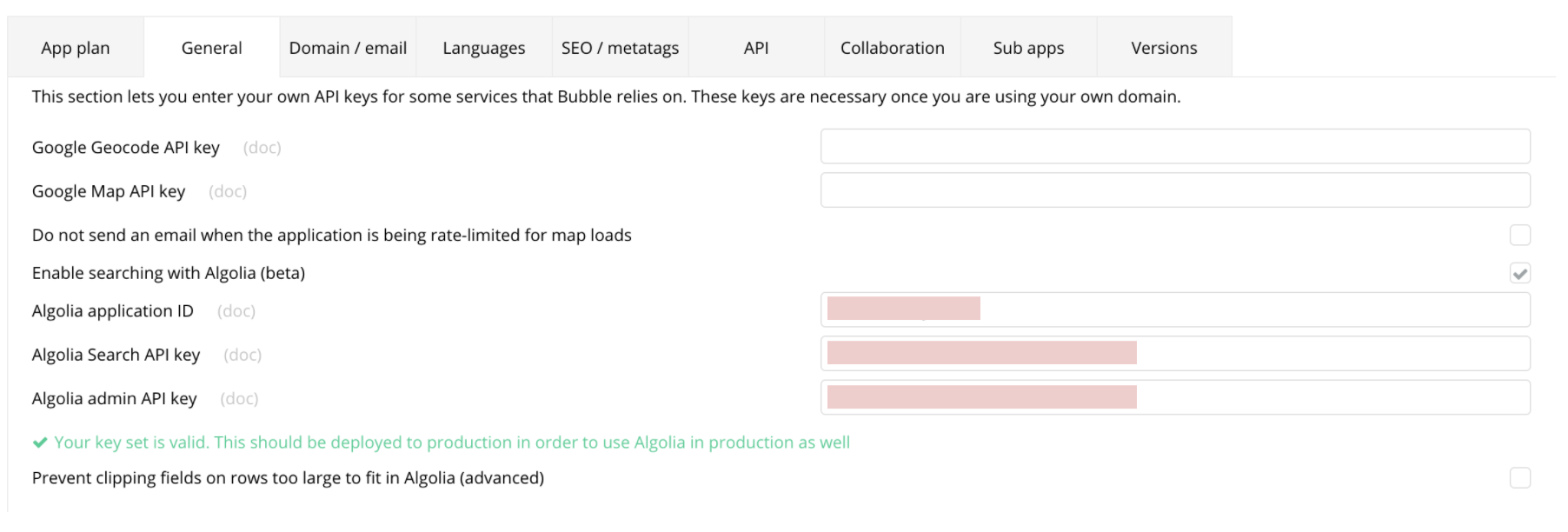 In your Bubble app, in Settings > General in the "General services API Keys" section, there is a checkbox for "Enable searching with Algolia" (if you do not see this checkbox, your app does not have this feature, chances are because it is not in the right tier). Once you check the box, you will see input fields for the application ID and two keys from the Algolia dashboard. Once you've copied and pasted those values in, the Bubble app will confirm that it thinks the keys are of the correct format (note the green text below):