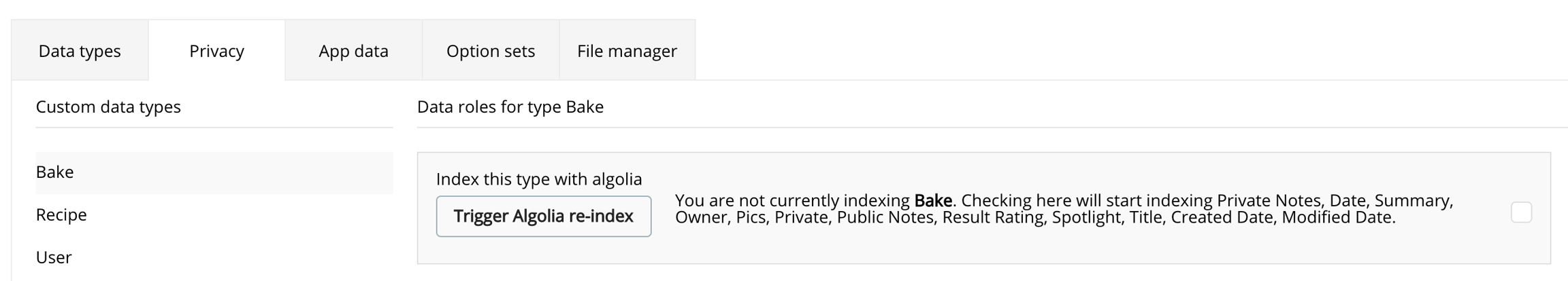After keys have been added, in the Privacy tab for every data type, you’ll see the option to index that type with Algolia.