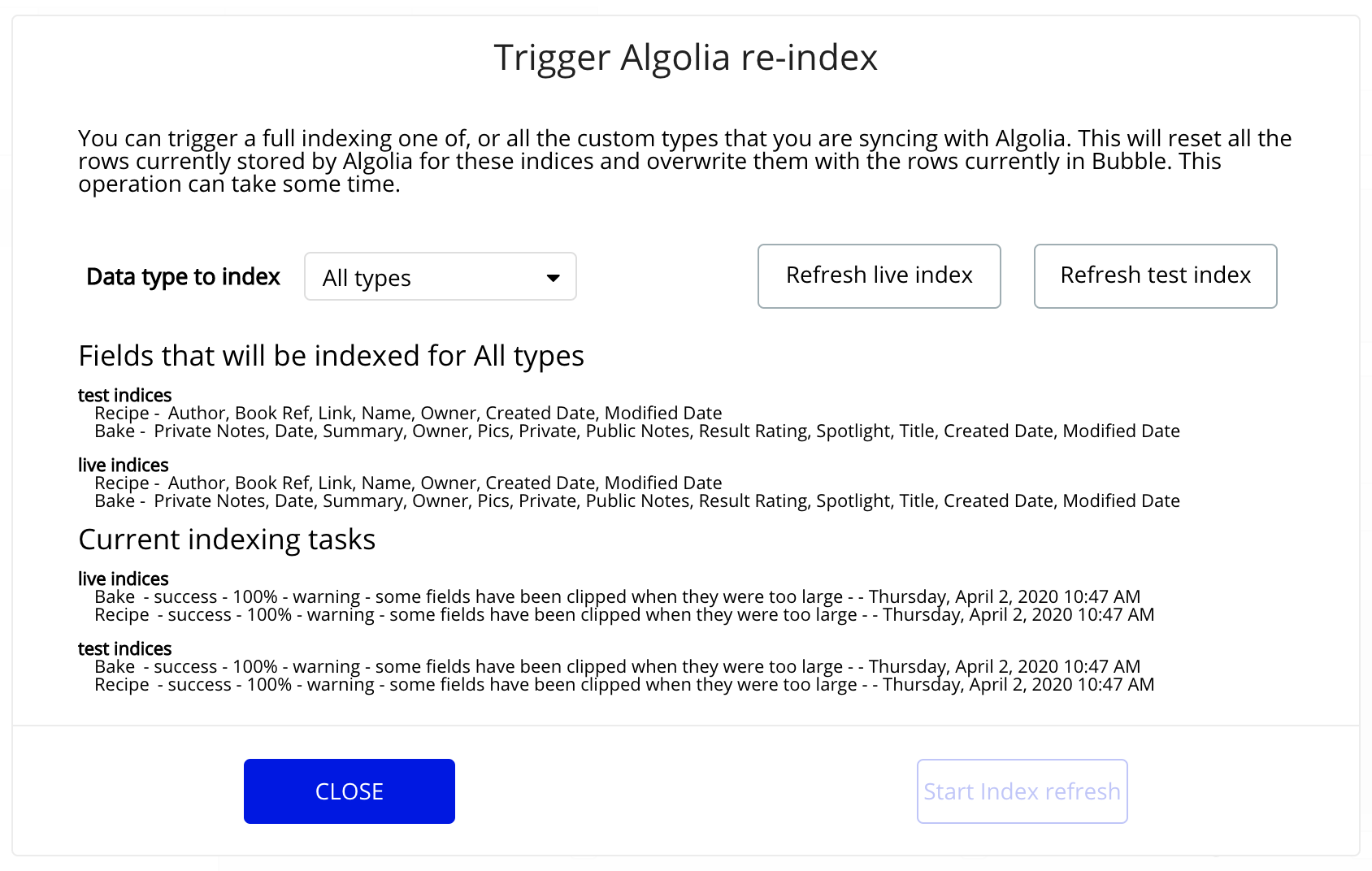 When things of an indexed data type are changed, added, or deleted, Bubble will automatically try to update the corresponding Algolia index for you. This should be generally reliable, but in the event that you find Algolia “out of sync” with your Bubble database, you can always trigger a full re-indexing in the same way as above.